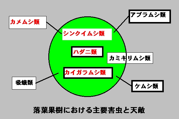 主要害虫のシンクイムシ類の天敵は有力なものが少ない。ゾウムシ類については天敵の存在も不明である。ハダニ類については多くの天敵がおり、今後の活用が大いに期待される。しかし、最大の害虫である飛来型害虫(カメムシ類、吸蛾類、カミキリムシ類)に利用できそうな天敵は認められず、落葉果樹での在来天敵の利用が限られることを示唆している。