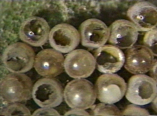 チャバネクロタマゴバチの寄生を確認している コガネコバチの脱出痕(クロタマゴバチに比べて不規則)