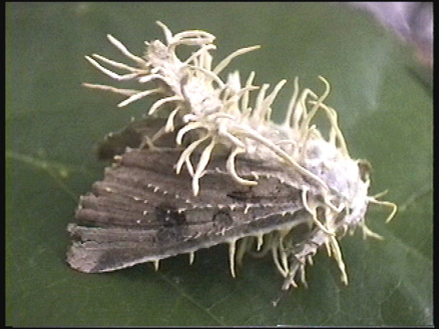 最近は抗癌剤として冬虫夏草が有名になりました.これは土壌中に生息する昆虫の幼虫や蛹に寄生した菌類がキノコとなって地面に顔を出したものです。素人が見付けるのはよほど偶然でしょう。一方、昆虫の成虫が菌類の寄生を受けて菌糸束を出すものは,要領が分かれば比較的簡単に見つかります。バッタや蛾の成虫、カメムシなどが植物の枝や葉の先端部にしがみ付くようにして死亡しています.寄生菌は高い場所から自分の胞子を遠くまで飛散させるため、昆虫が生きているうちに高い場所に誘導し、しっかりと脚で植物にしがみ付くように命令するのです。ここに示す写真は野菜の大害虫であるカブラヤガという蛾の成虫に発生したキノコです。菌糸束が腹部や翅の脈から出ている様子がよく分かります。キノコの種類はAcanthomyces属です。