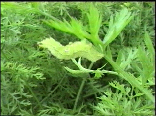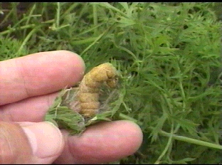 キクやニンジン等を餌とするキンウワバ類という蛾がいます。体をやや持ち上げて歩行する様子からシャクトリムシの仲間とも見られますが違った種類です。この害虫は密度がそれほど高まらないので、幼虫は人目に付くことがありません。9−10月にニンジンの葉をまとめて繭を作ったり、キクの葉を巻いたりするとやや目立ち易くなります。