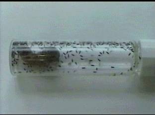 ガラス瓶中での羽化 待ちかまえている雄は直ちに交尾する