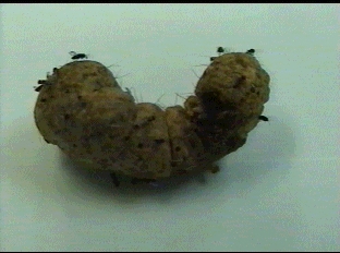 キンモンホソガトビコバチのマミ− ニンジンを加害虫のキクキンウワバ幼虫