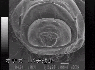 チュウゴクオナガコバチ幼虫(腹面に長い毛がある) 走査電顕で見た頭部と腹面の長毛