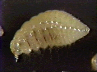 チュウゴクオナガコバチ幼虫の腹毛 クリタマバチのゴ−ルの中でクリタマバチ幼虫を食いつくしたチュウゴクオナガコバチは6月上旬には終令幼虫となり、暑い夏と秋をゴ−ルの中で過ごし12月には蛹になる。その間餌はとらず、静止しているものと思われます。幼虫の腹部には写真のような非常に長い毛がたくさん生えています。この毛の先端は縮れていてゴ−ルの内面に良く絡み付くようになっています。長い夏眠の間、風などによるゴ−ルの振動によって幼虫が振り回されるのを防ぐクッションとシ−トベルトの役目をしているのです。