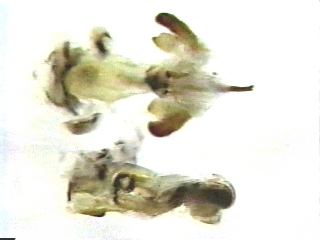 交尾器の先端部を正常な形で突出させるためには交尾器の外部ポンプを人為的に作動させるか、時間をかけて内部ポンプに水分が浸透するのを待つ。その結果得られたチャバネアオカメムシ、クサギカメムシ、フタモンホシカメムシの雄交尾器の形態は写真のようなものであった。